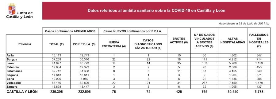 A día de hoy el acumulado de contagiados en Castilla y León asciende a 239.396, de los cuales 232.596 se diagnosticaron mediante pruebas de infección activa. En concreto, de los 76 casos notificados hoy, 72 han tenido diagnóstico el día previo.