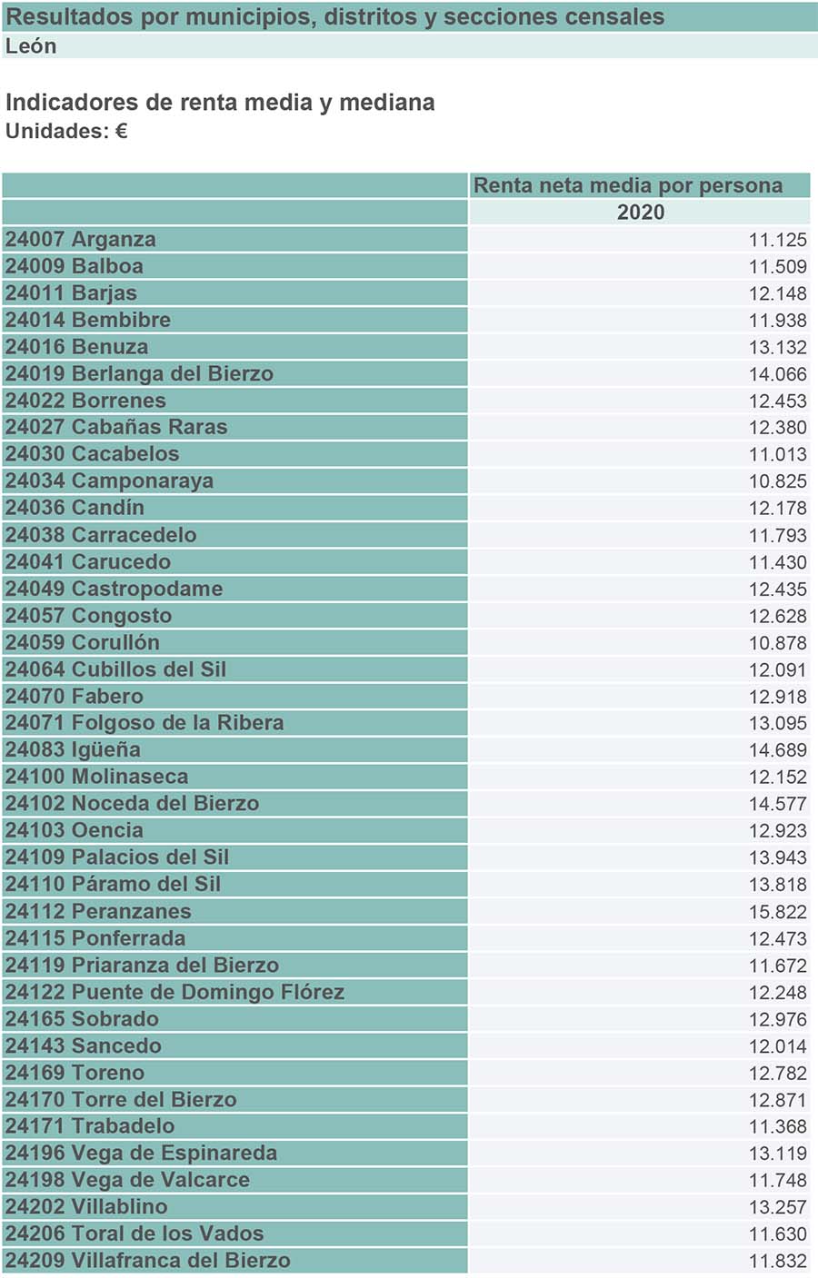 Sin embargo, el ejercicio 2020, el primero de la pandemia, ha hecho que tanto sólo aumente la renta disponible en Igüeña (21.493), Torre del Bierzo (20.204), y Cubillos del Sil (19.665), viéndose reducida en el resto de municipios.