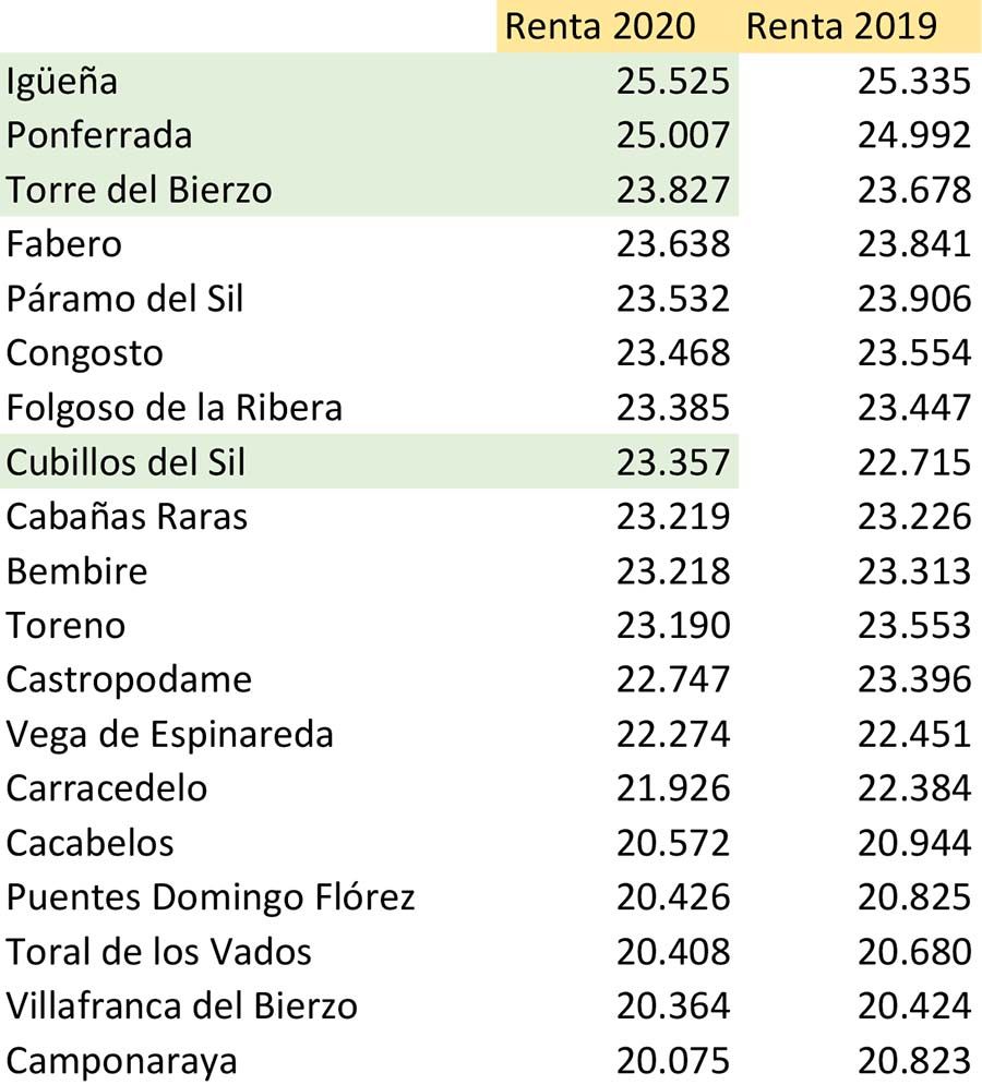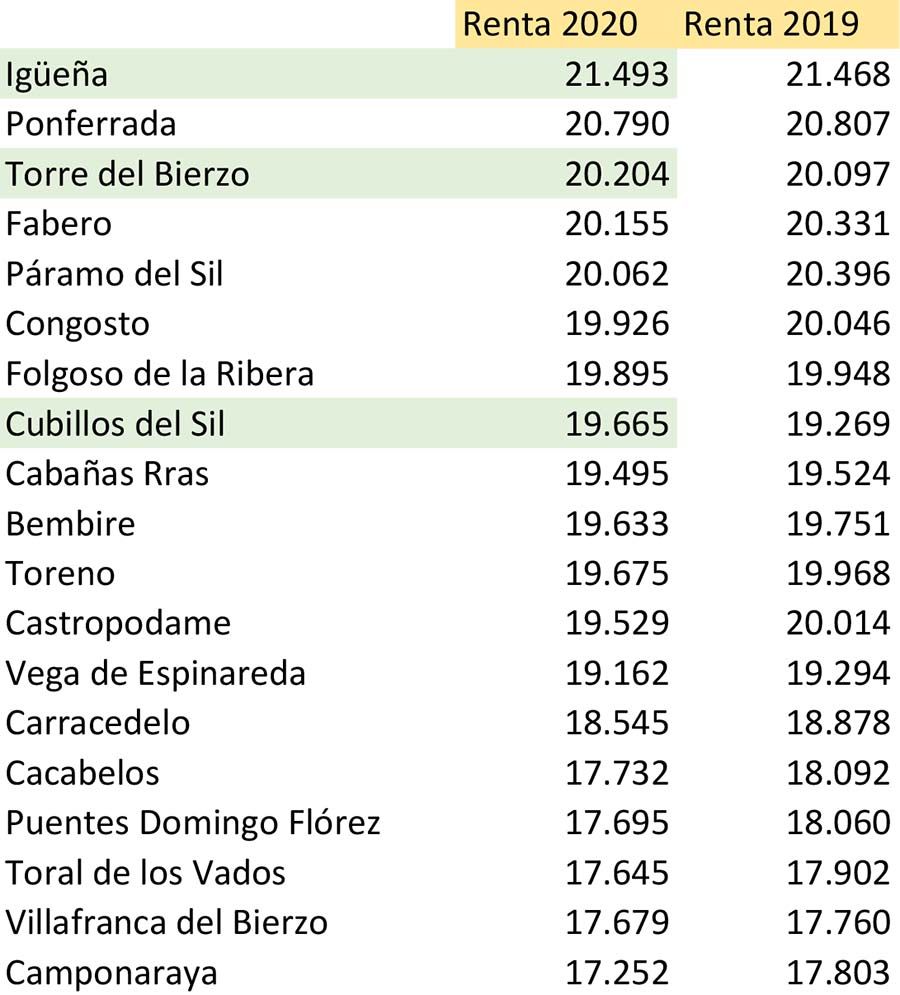 También afianza su puesto en n.º 2, Ponferrada, con una renta media de 25.007, también por encima de los 24.992 que registraba en la campaña previa. El municipio que ha escalado puesto ha sido Torre del Bierzo, que se encuentra en el 'tercer puesto' con una renta media de 23.827, frente a los 23.678 del 2019. Páramo del Sil, que hasta ocupó el tercer puesto el año pasado, ha caído hasta el quinto, con 23.532, por debajo de Fabero con 23.638.