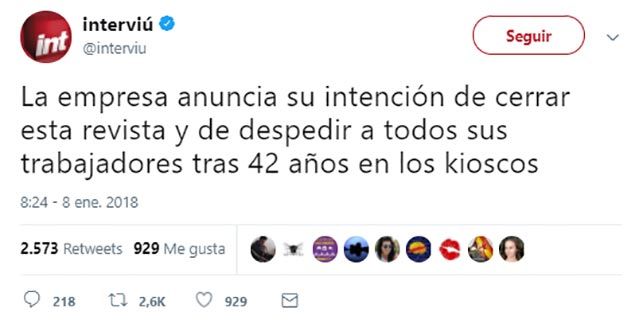 Las revistas Interviú y Tiempo, ambas del grupo Zeta, dejarán de publicarse, tal y como ha comunicado al dirección de la empresa a los trabajadores de las dos publicaciones. Interviú lleva en el mercado desde hace 42 años. Se fundó en 1976 y ha combinado el reclamo de las mujeres en portada con importantes reportajes de investigación en informaciones de relevancia. Tiempo comenzó su andadura en 1982, cuando se separó de Interviú para convertirse en una publicación de carácter más político.