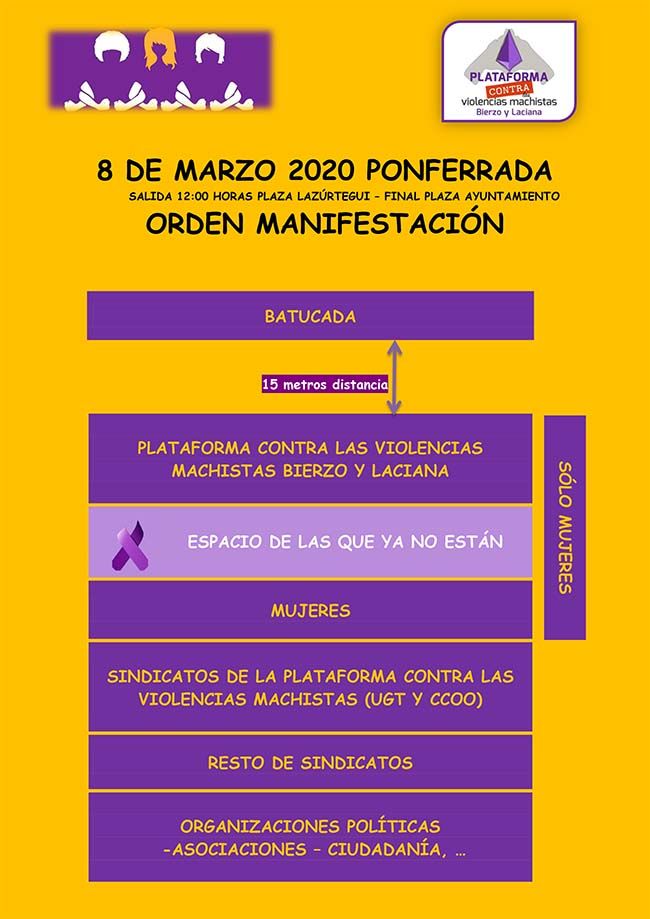 La Plataforma contra las violencias machistas del Bierzo y Laciana -convocantes de la manifestación- han insistido en el orden de la marcha "para que todo discurra de la mejor forma posible", donde se reservará un espacio para las asesinadas por la violencia machista. En primer lugar irá la batucada, separada a 15 metros de la Plataforma contra las violencias machistas. Tras ellas irá el espacio reservado "para las que ya no están" -indicado con pancartas-, seguida de un grupo de mujeres entre las que destacan varias formaciones deportivas como el equipo de Bierzo Rugby Femenino, el de baloncesto +Q Pachangas CDP y el Club de Gimnasia Aros 5. Los sindicatos integrados en la Plataforma (UGT y CCOO) serán los siguientes; y detrás el resto de sindicatos, partidos políticos, asociaciones y el resto de la ciudadanía.