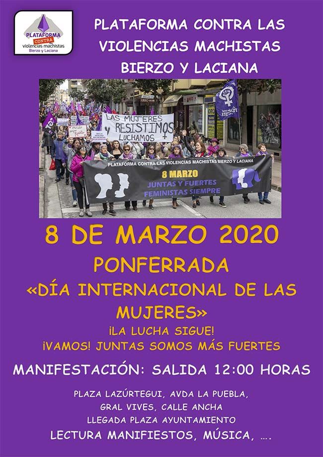 Ponferrada se suma este domingo 8 de marzo (Día Internacional de la Mujer) a la 'Revolución Feminista' con una manifestación que partirá a las 12.00 horas de la plaza Lazúrtegui. En esta ocasión, la huelga laboral, estudiantil y de consumo celebrada en años anteriores bajo el lema 'Si nosotras paramos se para el mundo' se sustituye por la 'Revolución', "por la imposibilidad de muchas mujeres de secundarla por sus condiciones personales y laborales, para que todas puedan tener una presencia y participación plena", ha señalado Milagros Ballesteros, miembro de la Plataforma contra las violencias machistas del Bierzo y Laciana. El pasado año se rozaron los 10.000 asistentes  y la organización espera que la calle sume voces a estas reclamaciones.