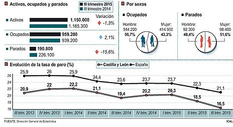 Por lo que respecta al global de Castilla y León, el número de desempleados se redujo en el tercer trimestre del año en 22.300 personas, al cerrar la cifra de parados en 190.800 personas, lo que supone una bajada del 10,48%, En España, los parados bajaron en 298.200 personas, un 5,79%, en el segundo trimestre del año, al cerrar el período de junio a septiembre con 4,85 millones de desempleados. Con estas cifras, la tasa de paro se situó en el 16,59% en la Comunidad, mientras que en el país alcanzó el 21,18%.