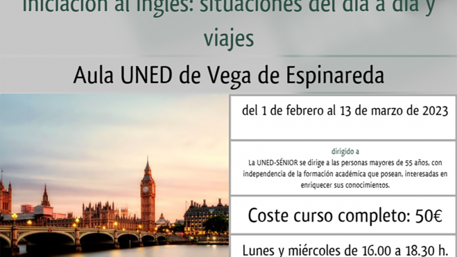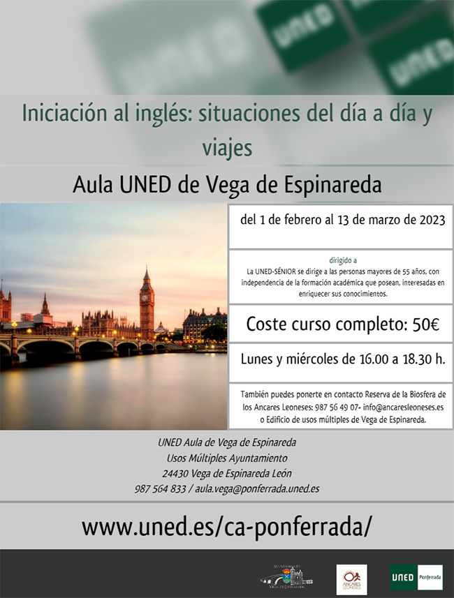 Tendrá lugar en el Aula UNED de Vega de Espinareda los lunes y miércoles de 16.00 a 18.30 horas a partir del 1 de febrero y tiene un coste total de 50 euros, con certificado final.