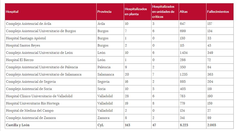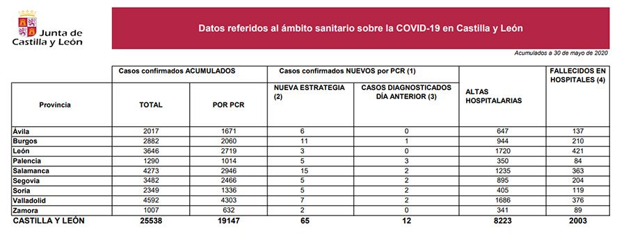 En total los casos en la Comunidad asciende en estos momentos a 25.538. Además, se registraron 4 nuevas muertes en el ámbito hospitalario (2.003) y 33 altas (8.223 totales ). Asimismo, de acuerdo a la nueva estrategia de Sanidad, Ávila, León y Zamora no registraron este viernes nuevos casos, mientras que los 12 diagnosticados corresponden a Burgos (1), Palencia (3), Salamanca (2), Segovia (2), Soria (2) y Valladolid (2).