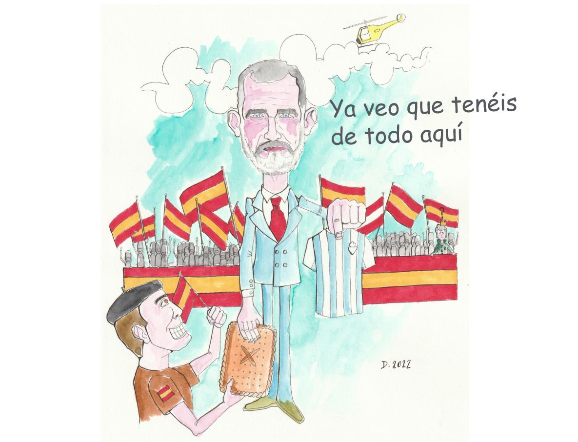 Nuestro dibujante de cabecera, Daniel Buitrón, recoge la escena del Felipe VI con los dos regalos que se lleva del Bierzo: Una camiseta del centenario de la Ponferradina, y una empanada de la Liébana. Desde ahí tiramos como siempre de humor e ironía. Con estos agasajos seguro que se ha dado cuenta, como dice el 'bocadillo' de la viñeta: "Ya veo que tenéis aquí de todo".