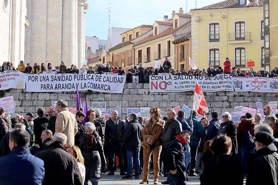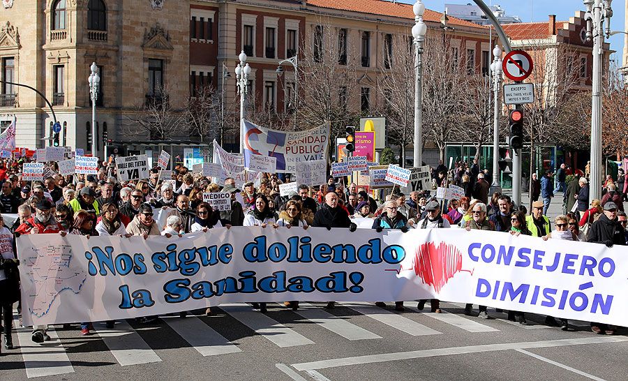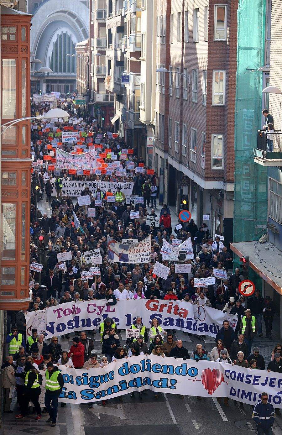 A la cabeza de la manifestación, representantes de las plataformas portaban una gran pancarta en la que se podía leer '¡Nos sigue doliendo la Sanidad' y ‘Consejero dimisión’, tras la cual se situaban las tres médicos de familia del centro de salud de Los Cubos en Burgos, que el pasado 12 de enero dimitieron denunciando la insostenibilidad del sistema (Nuria Adrián de la Fuente, Sonia Andrés y Pilar Obregón), junto al portavoz de la Federación de Asociaciones para la Defensa de la Sanidad Pública, Marciano Sánchez Bayle, y el médico portavoz de la Plataforma en Defensa de la Sanidad Pública, Luis Ocampo, entre otros.
