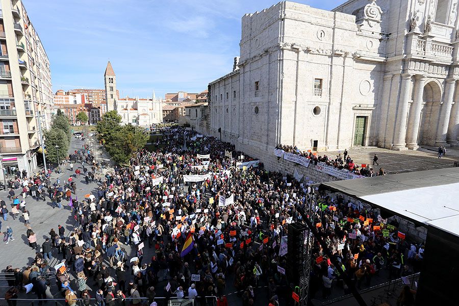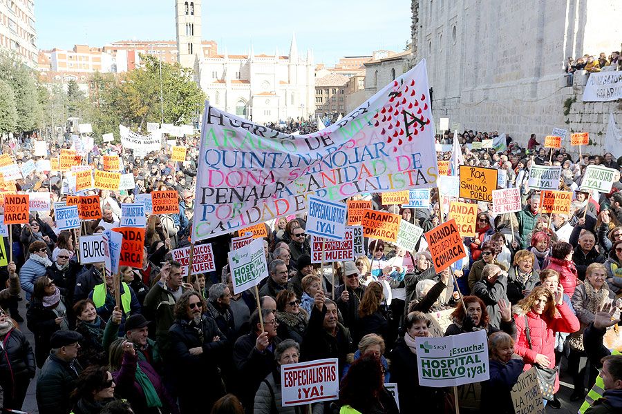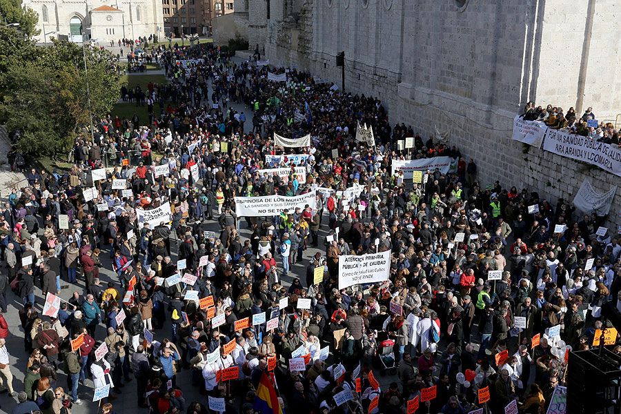 Miles de personas -15.000 según los cálculos de la Policía Nacional, facilitados por la Subdelegación del Gobierno- se concentraron al mediodía de hoy en Valladolid y recorrieron sin incidencias las principales calles de la ciudad en una manifestación convocada por 18 plataformas en defensa de la sanidad pública de la Comunidad. Con un sol brillante y frío seco, los participantes exigieron la dimisión del consejero de Sanidad, Antonio María Sáez Aguado, a quien responsabilizan de forma directa del deterioro general del sistema y la desatención que padecen el medio rural y la Atención Primaria. Entre sus reivindicaciones también incluyeron la necesidad de “acabar de una vez por todas con los recortes”, recuperar todo el empleo perdido y reducir las listas de espera.