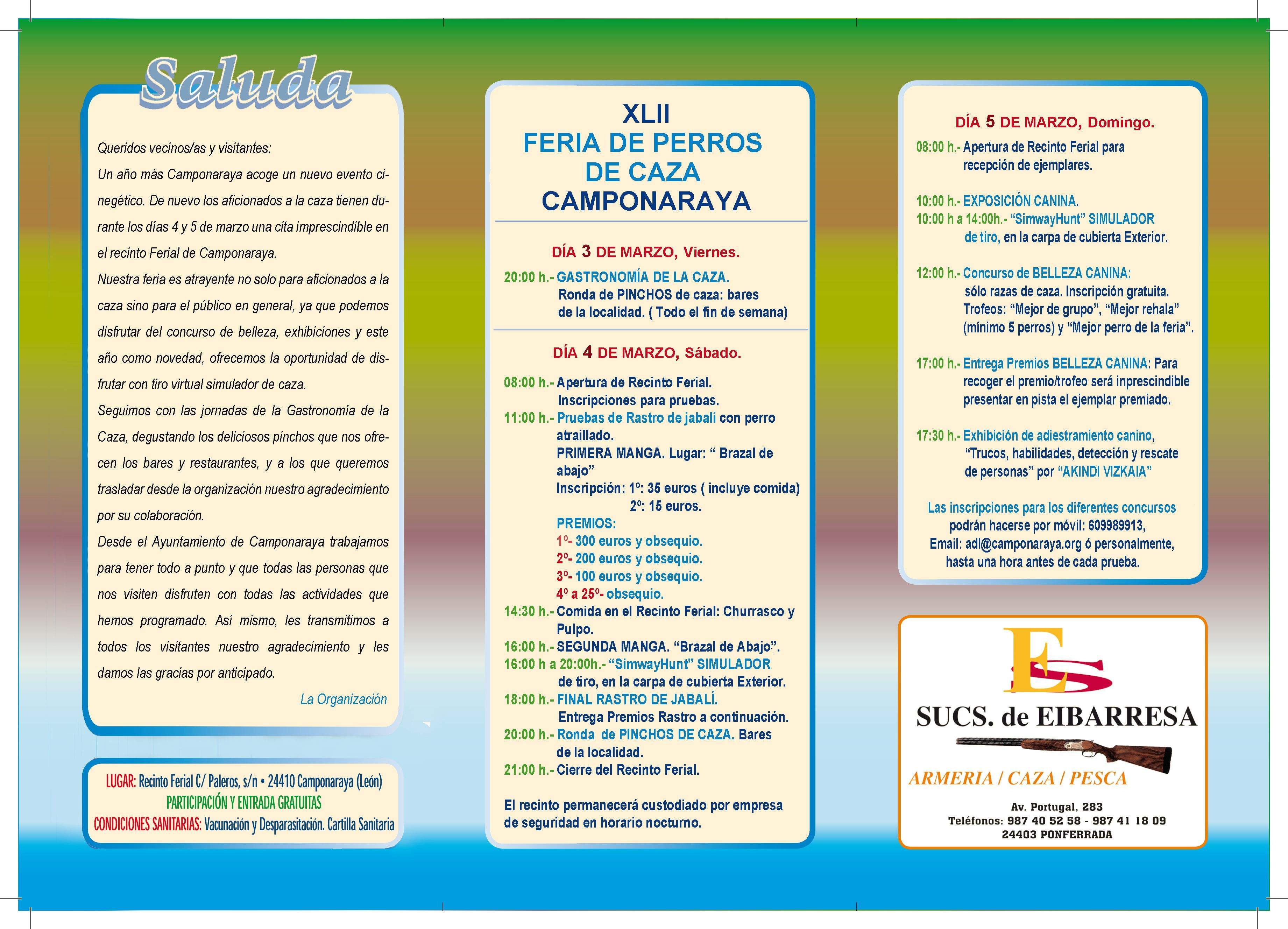 Esta Feria supone un trabajo muy importante, sobre todo para Camponaraya, que tiene un límite en el ámbito personal, y ha querido agradecer la labor de los voluntarios que ayudan a preparar la Feria, especialmente a Arturo Castañeiras coordinador de la actividad de rastro de jabalí, que se celebrará en el campo de Brazal el sábado por la mañana, en su primera manga, y por la tarde, en la segunda.