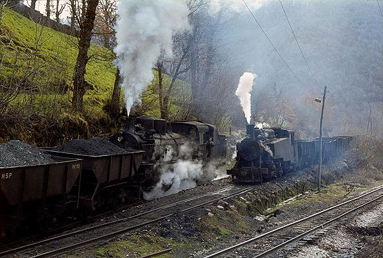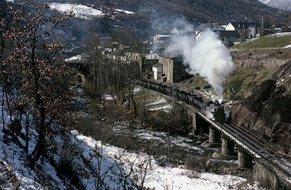 Un antiguo tren de vapor cruza el puente de Rioscuro, en dirección a Villaseca de Laciana