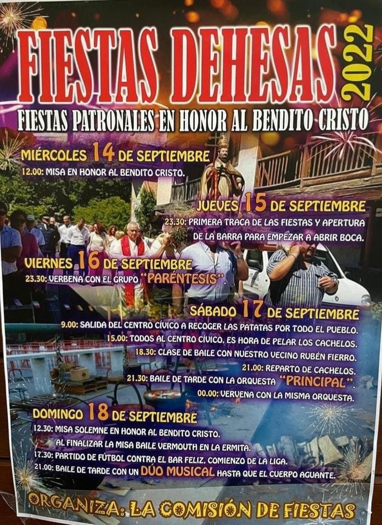 Las fiestas de Dehesas 2022 en honor al Bendito Cristo darán comienzo este miércoles 14 de septiembre con misa a las 12:00 horas. El jueves 15, a las 23:30 horas, primera traca de las fiestas y apertura de la barra "para empezar a abrir la boca". El viernes, día 16 de septiembre, verbena con el grupo 'Paréntesis' a las 23:30 horas. Ya el sábado 17, el día dará comienzo a las 9:00 horas para recoger las patatas del pueblo con salida desde el Centro Cívico.