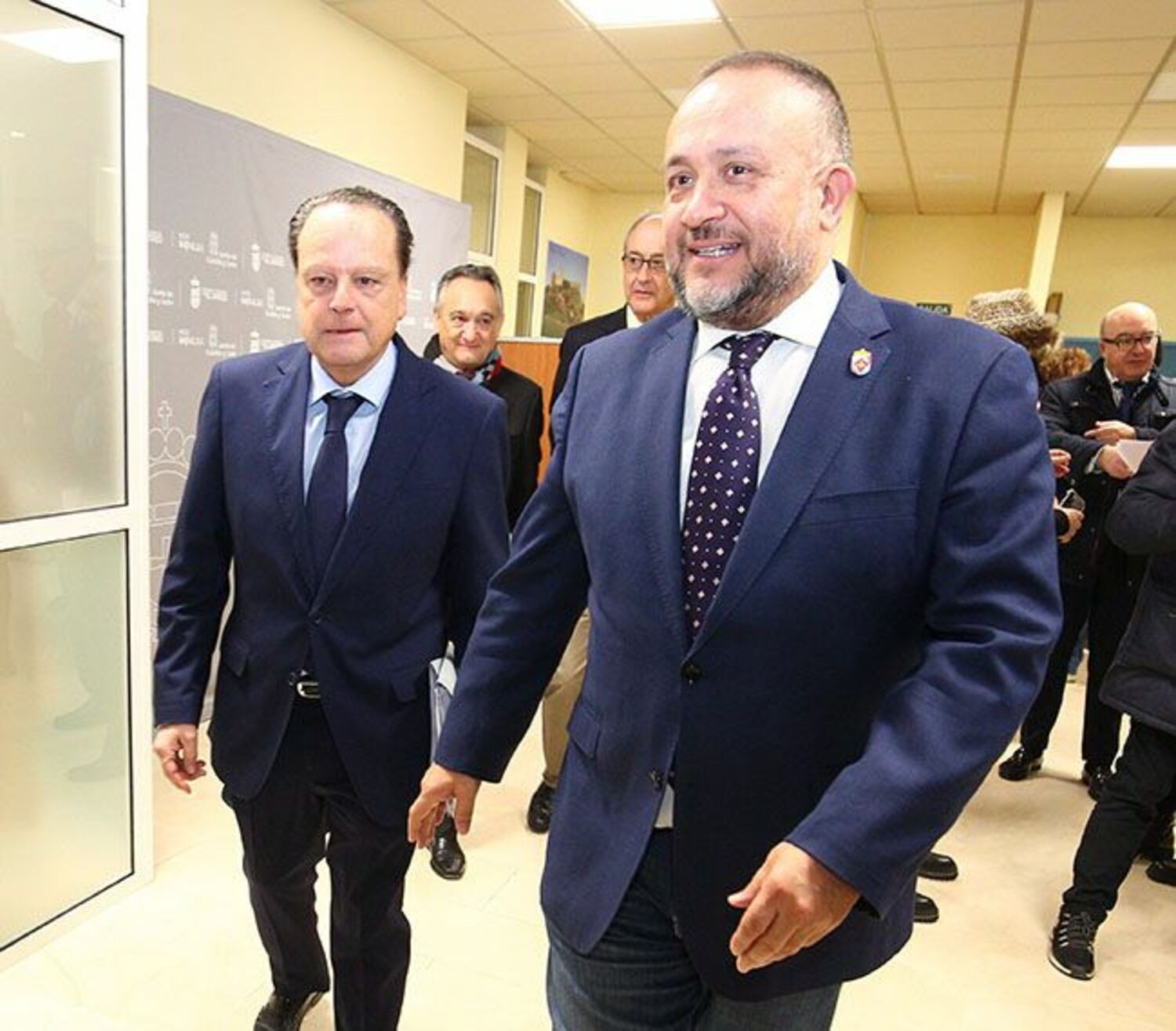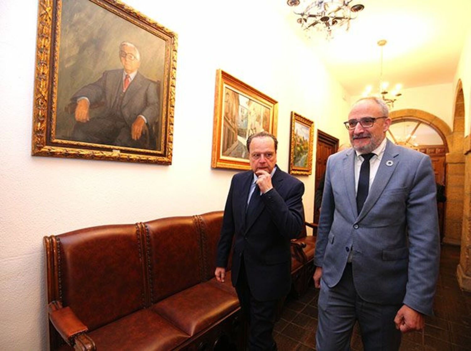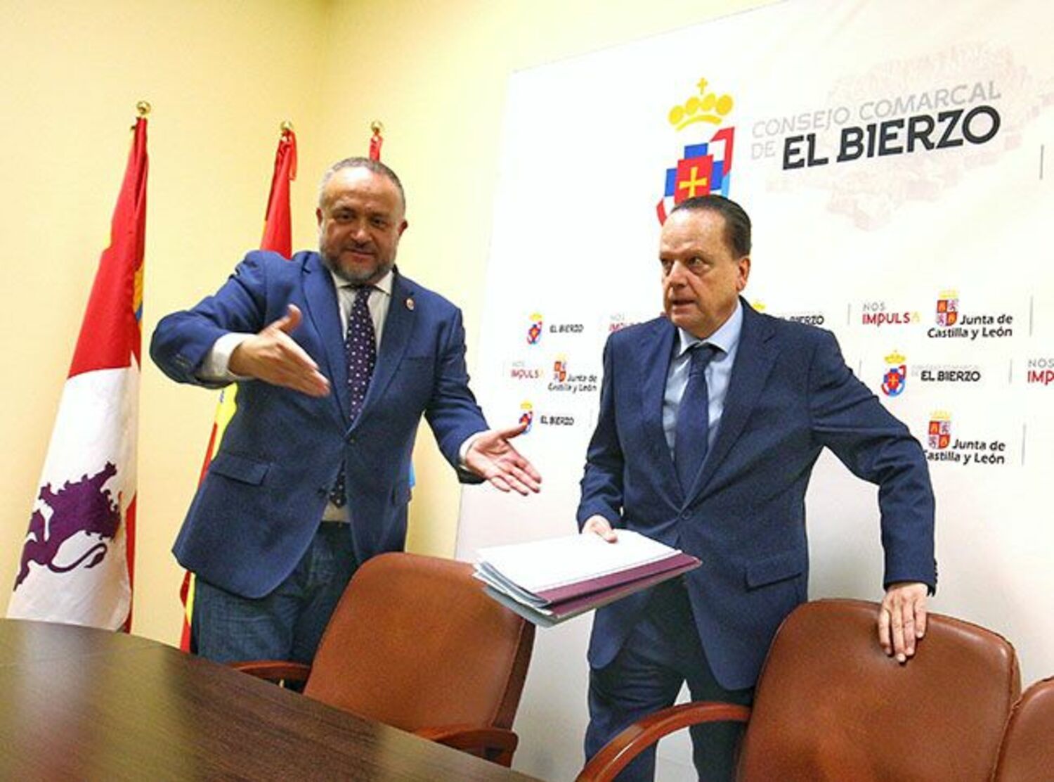 El presidente del Consejo de Cuentas, Mario Amilivia (I), junto al presidente del consejo Comarcal del Bierzo, Gerardo Álvarez Courel (D), durante la visita institucional de esta mañana