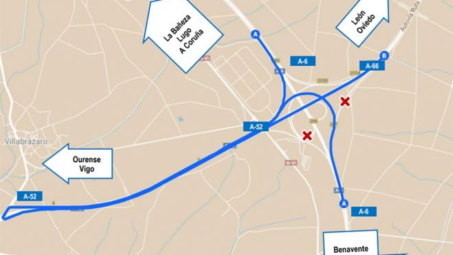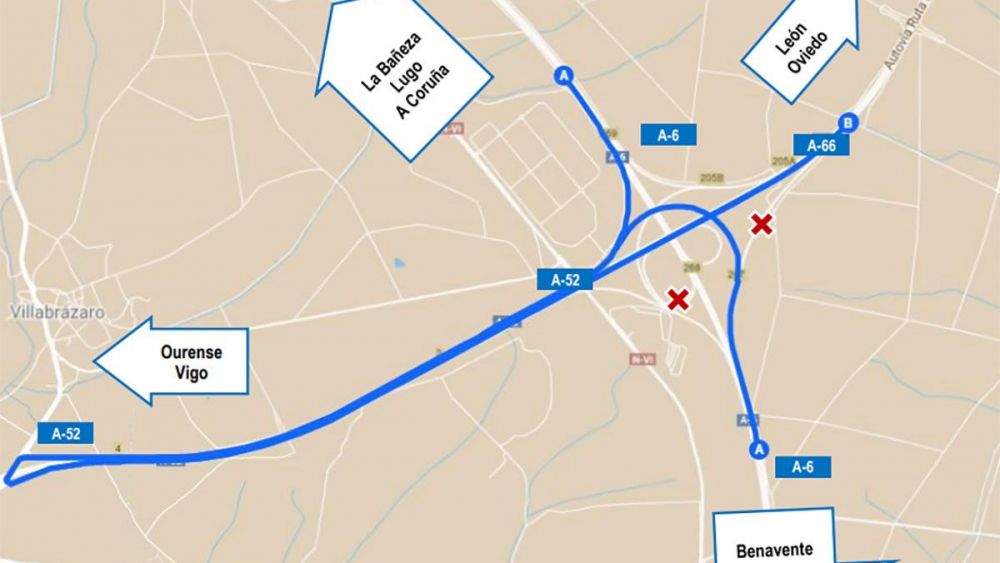 En función de las necesidades de la obra, será necesario realizar un corte completo de los ramales de la autovía A-6 que conectan con la A-66 en sentido León y Oviedo. Los vehículos afectados por estos movimientos deberán desviarse por la A-52 y realizar un cambio de sentido en el enlace 4 para dirigirse a León y Oviedo.