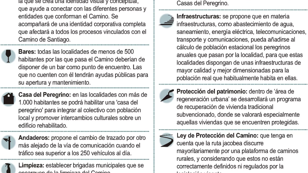 Por otro lado, el documento considera que las localidades por las que pasa el Camino tienen una población estacional especialmente alta debido al incremento poblacional que supone el paso constante de peregrinos. Al respecto, se propone que a los efectos del dimensionado de infraestructuras, como son las de abastecimiento de agua, saneamiento, energía eléctrica, telecomunicaciones, transporte y comunicaciones, “pueda añadirse el cálculo de población de la media de peregrinos anuales que pasan por la localidad” para incrementar los servicios de estas localidades”.