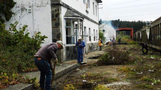 Este inmueble había sido "saqueado y vandalizado y se hallaba totalmente recubierto por una abundante vegetación que crecía ante la fachada y los andenes", lamentan desde Promonumenta. Aunque la hacendera consiguió eliminar la vegetación de las dos fachadas y limpiar de cascotes y basura las dependencias de la planta baja, adelantan que queda pendiente la limpieza total del andén y el desescombro y limpieza de la planta superior, que será preciso acometer en una próxima hacendera.