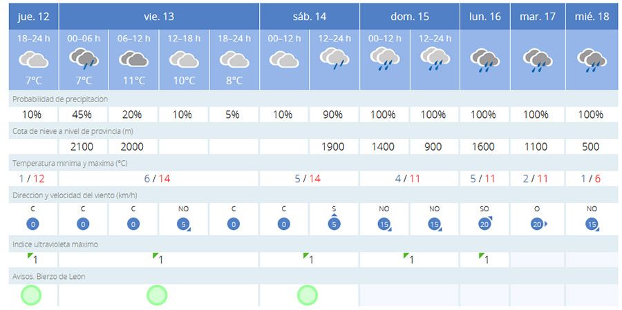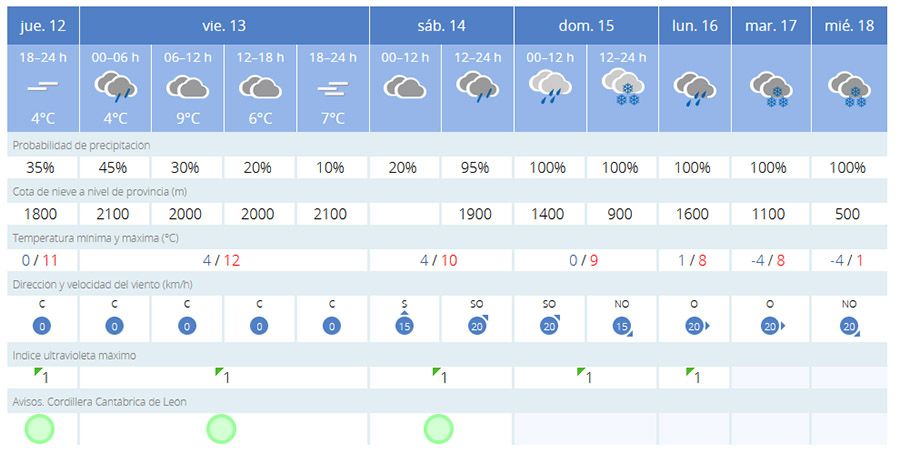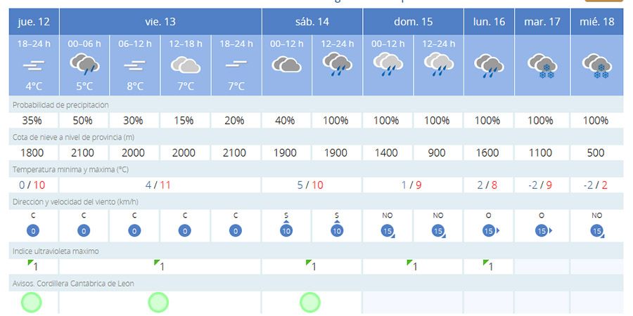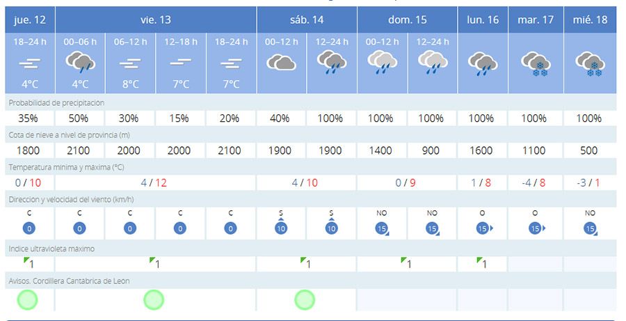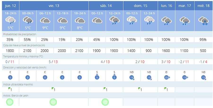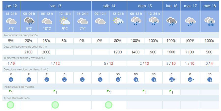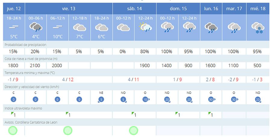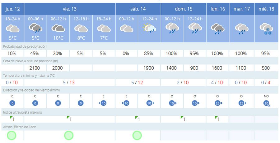Sin embargo, en Laciana ya este fin de semana podrían tener su primera nevada, ya que el domingo, la cota en Villablino es de 900 metros.