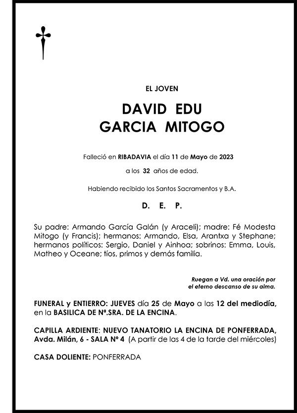 Efectivos de la Guardia Civil localizaron hoy en la localidad ourensana de Ribadavia el cuerpo sin vida del futbolista berciano de 32 años David García Mitogo, que llevaba desaparecido desde el pasado 11 de mayo. El operativo de búsqueda halló su cadáver en las aguas del río Avia, cerca de la unión de este curso con el Miño.