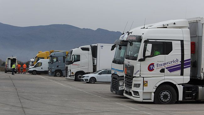 Camiones embolsados en el aparcamiento de emergencia de CamponarayaAsí lo ha manifestado en el transcurso de una reunión celebrada esta mañana en la Delegación del Gobierno y en la que ha estado acompañada por los responsables en la comunidad autónoma de la Policía Nacional y de la Guardia Civil. Según ha dicho la delegada “hemos estado a lo largo de estos días ya en contacto de manera individual con los ahora convocados al objeto de hacer un análisis conjunto y hemos estado dando respuesta a las necesidades que se nos han estado planteando”.