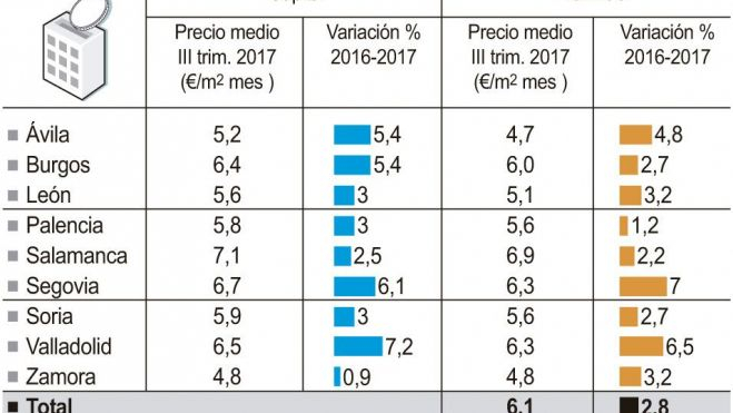 Los precios más caros, por provincias, se localizaron en Salamanca, Segovia y Valladolid, con 6,9 y 6,3 euros el metro cuadrado, es decir, 690 y 630 euros, al mes para una vivienda de 100 metros. La misma casa costaría, por el contrario, 470 euros en Ávila o 480, en Zamora. En valores intermedios se sitúan Burgos (600 euros), Palencia y Soria (560) y León (510). Sin embargo, en España, su precio sería muy superior a la media de Castilla y León -610 euros-, ya que alcanzaría los 800.