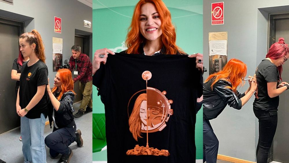 Los alumnos del Campus de Ponferrada han querido homenajear la visita de la astronauta Sara García recibiéndola con una camiseta con un exclusivo y personalizado diseño dedicado a la leonesa. La impresión que aparece en la camiseta ha sido obra del diseñador berciano Alejandro De La Fuente Vidal, que ha combinado la cara de Sara, con un satélite -la Luna o Marte- y separados por un cohete despegando.