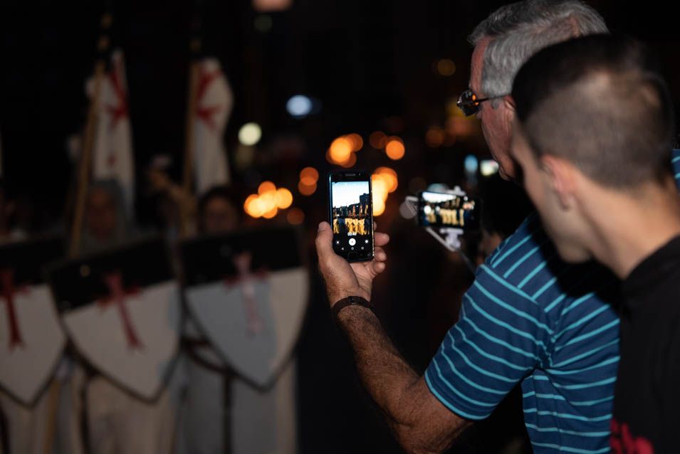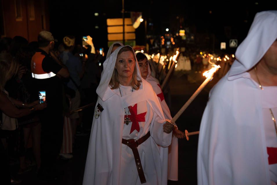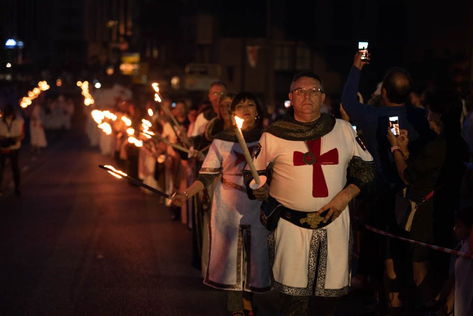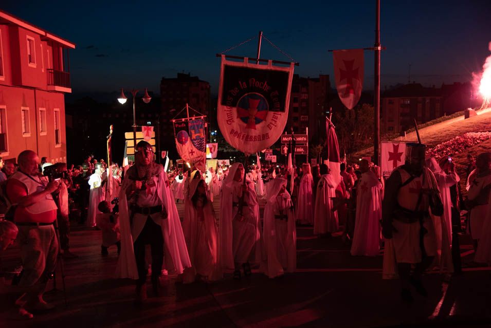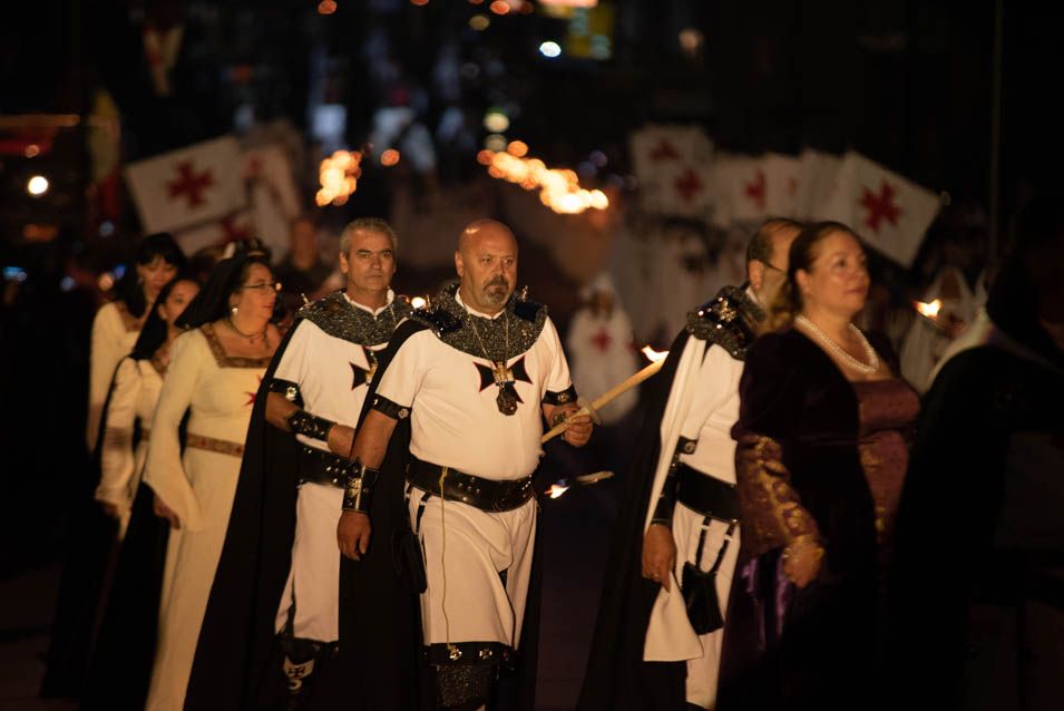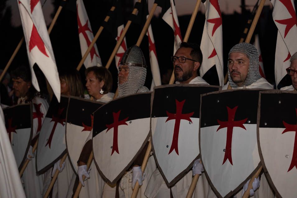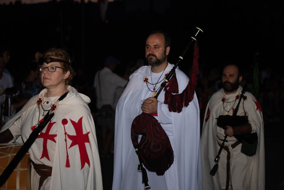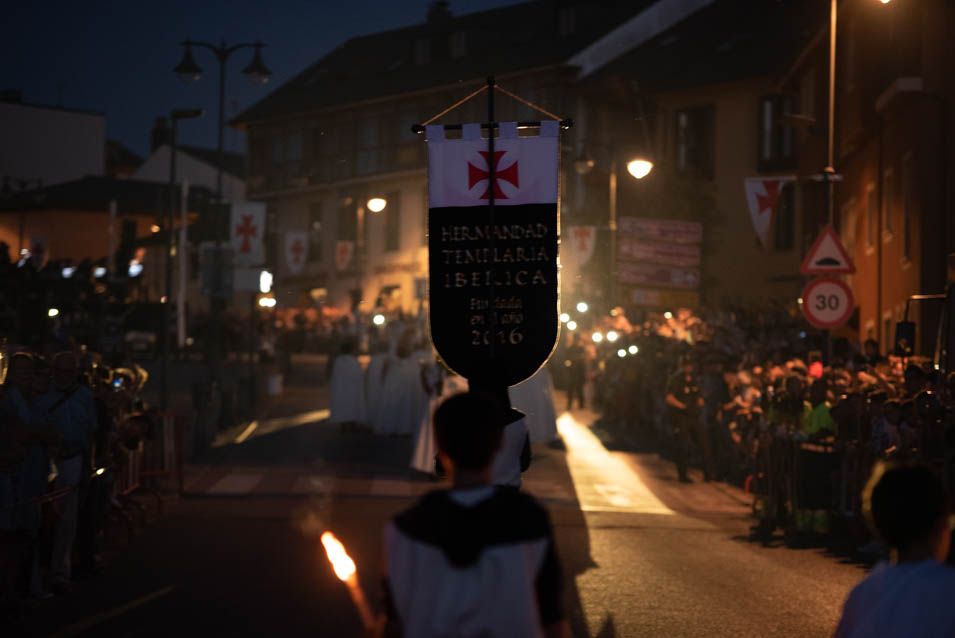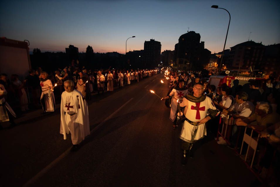 Los caballeros de la Orden han cumplido este sábado con la leyenda en el acto principal de la Noche Templaria, desfilando por las calles de Ponferrada envueltos por efectos pirotécnicos y la música de la Banda de la Ciudad. En el paseo han participado las asociaciones de recreación templarias junto a los ciudadanos ataviados de época.