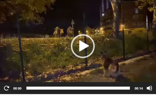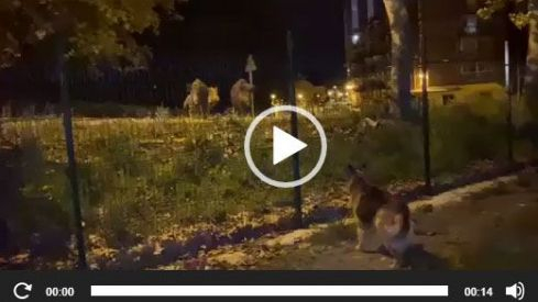 Por tercer día consecutivo los lectores nos hacen llegar vídeos de la ocupación de espacios urbanos por jabalíes, en este caso en una pequeña manada, que se encara con un perro en plena ciudad.
