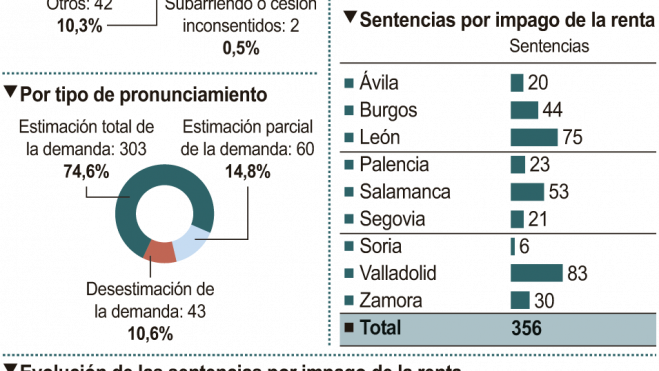 Por otra parte, el 74,6 por ciento de las sentencias por arrendamientos urbanos emitidas en 2017 en Castilla y León estimaron totalmente la demanda presentada, principalmente por impagos. Además, un 10,6 por ciento se desestimaron y un 14,8 por ciento, se estimaron de forma parcial.