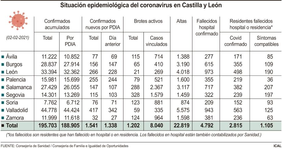 El número total de positivos en la Comunidad, asciende a 195.703, de los que 188.905 se confirmaron por PCR. Los positivos se concentran en Valladolid, 44.778; León, 33.394; Burgos, 28.837; y Salamanca, 27.429. Además, hay 15.981 en Palencia; 14.301 en Segovia; 11.999 en Zamora; 11.222 en Ávila; y 7.762 en Soria.