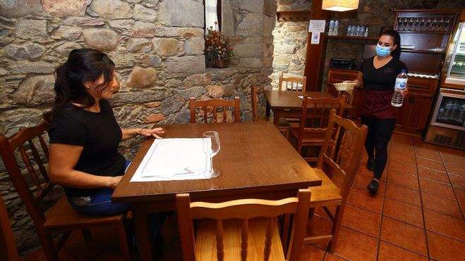 El pasado lunes fue el día en que el mesón pudo reabrir las puertas de sus dos salones. En uno de ellos, las ocho mesas habituales se han reducido a cuatro, mientras que en el salón grande actualmente hay siete mesas, frente a las 12 que habían antes del estallido de la pandemia. “Podemos poner más de la mitad de las mesas porque aún así respetamos los cinco metros de seguridad, pero no podemos superar el 40 por ciento del aforo, es decir 32 personas”, explica la responsable del restaurante. “Puedo tener todas las mesas ocupadas, pero no con más de tres personas”, resume.