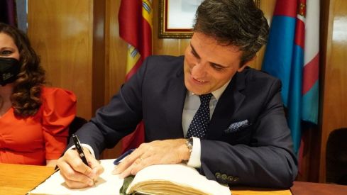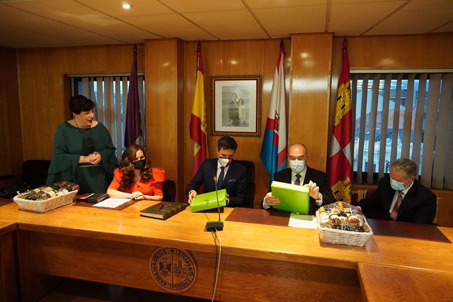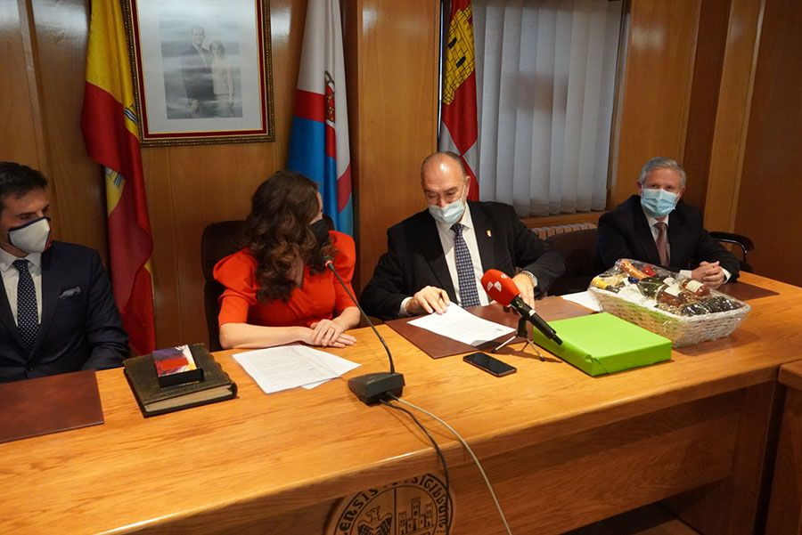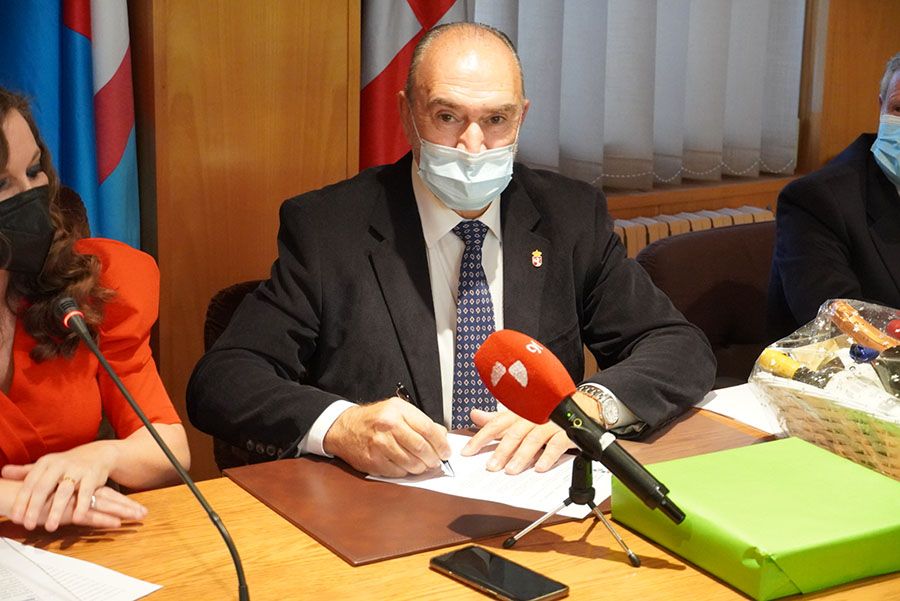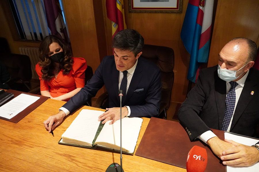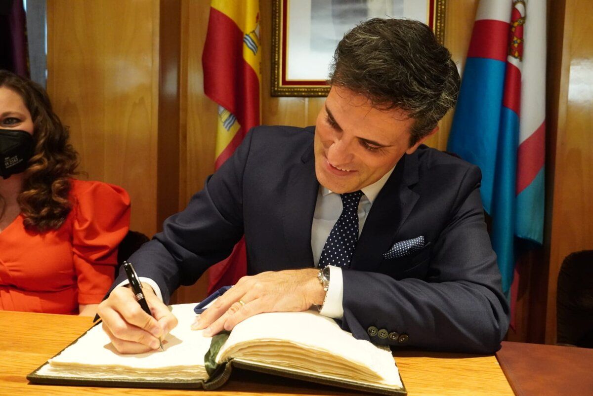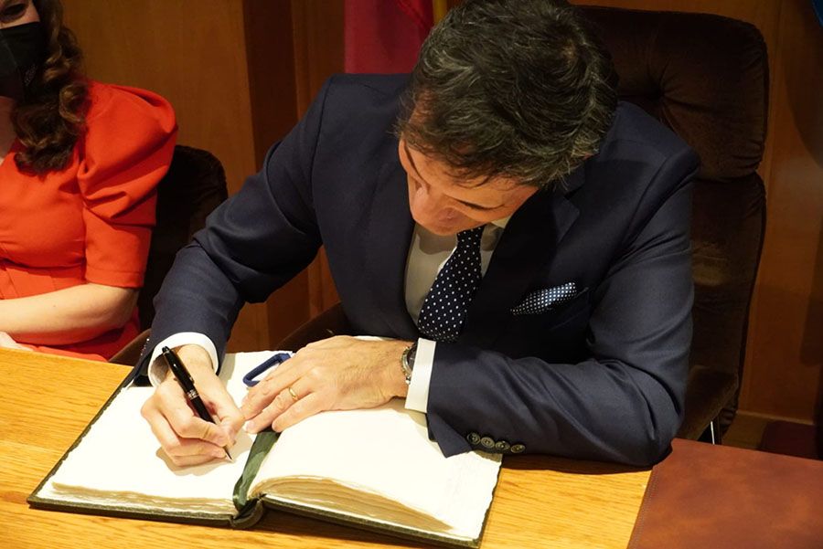 El locutor, actor, monologuista, presentador y mantenedor de la XLIX edición del Festival Nacional de Exaltación del Botillo, Luis Larrodera, ha plasmado su firma en el libro de honor de Bembibre en el acto previo a la gran gala y broche de oro de este fin de semana dedicado al embutido rey de la Comarca.