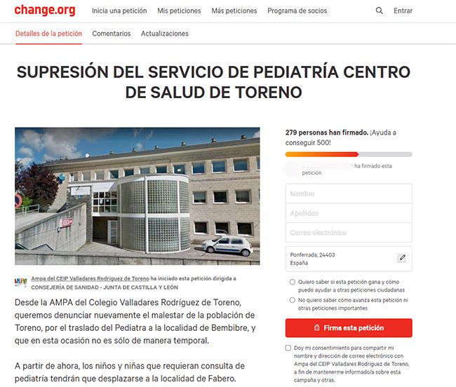 La Asociación de Madres y Padres del Colegio Valladares Rodríguez de Toreno ha indicado una campaña de recogida de firmas en la plataforma change.org en protesta por la supresión del servicio de pediatría en el centro de salud del municipio. Denuncian a través de esta campaña su "malestar" por el traslado del pediatra a Bembibre de manera indefinida. Como resultado, los niños y niñas del municipio de Toreno deberán trasladarse al médico de Fabero para ser atendidos.
