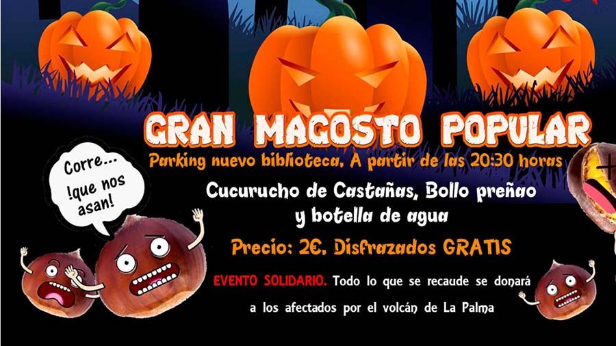 Desde las 19 a las 20:30 horas se suma a la celebración el pasacalles a cargo de la charanga Lou Band. Y a partir de esa hora se suma al Halloween el Magosto popular solidario realizado por la agrupación de moteros Cuervos Rojos, en el aparcamiento nuevo de la Biblioteca. Los niños disfrazados podrán acceder a él de manera gratuita y el resto abonará dos euros para ayudar a los afectados por el volcán de La Palma.
