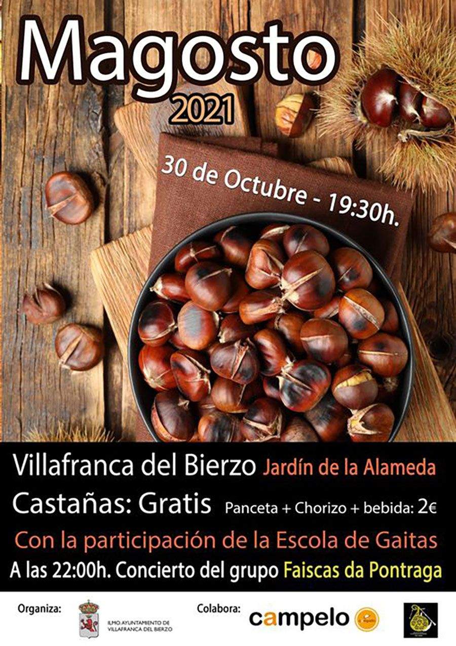 El Ayuntamiento de Villafranca del Bierzo también cita a sus vecinos y vecinas en un magosto popular el sábado 30 de octubre a partir de las 19:30h. Habrá barra libre de castañas para todos los asistentes y, por el módico precio de 2 euros también podrás disfrutar de panceta, chorizo y bebida.