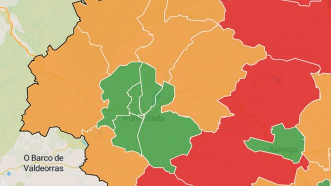 Así, las 4 zonas básicas de salud de Ponferrada y Cacabelos se encuentran en el indicador verde, es decir, con entre más 800 y menos o 1.500 tarjetas por médico. El grupo más amplio de áreas de salud del Bierzo está en naranja, lo que supone que cada facultativo tenga entre 400 y 800 tarjetas. Es el caso de Puente de Domingo Florez, Villafranca del Bierzo, Fabero, Toreno, Bembibre y también la capital de Laciana, Villablino.