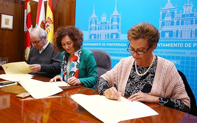 César Sánchez / ICAL El responsable del Albergue, Antolín de Cela; la alcaldesa de Ponferrada, Gloria F. Merayo; y la vicerrectora de Relaciones Institucionales de la Universidad de Elche, María Teresa Pérez, durante la firma del cuarto convenio