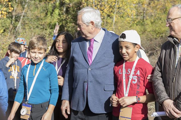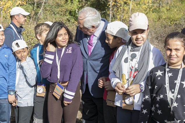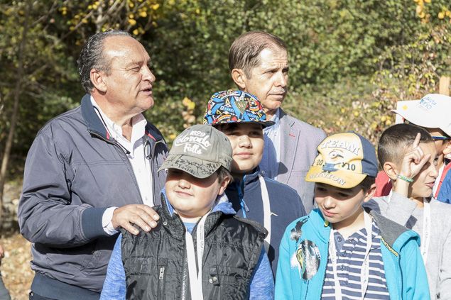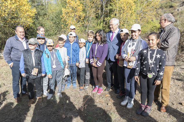 El delegado territorial de la Junta, Guillermo García (I) y el presidente de la CHMS, Francisco Marín (C), junto a los niños y profesores del CEIP Flores del Sil - Mario de la Torre