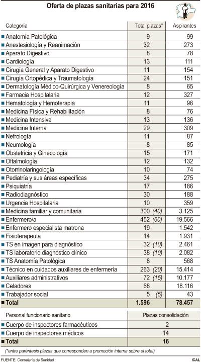 Las 1.596 plazas para personal estatutario fijo de Sacyl incluyen 1.436 de turno libre, a las que aspiran 77.424 opositores, y 115 de promoción interna, con 1.033 inscritos en las pruebas. Las 452 plazas de Enfermería se las disputarán 19.566 profesionales, mientras que las 300 de Medicina de Familia, tan solo 3.125. También 15.414 personas pretenden hacerse en esta convocatoria con 263 puestos de auxiliares de enfermería.