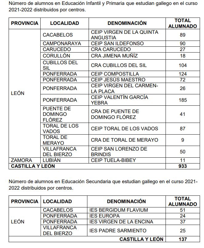 La Junta de Castilla y León colabora desde hace años con la Xunta de Galicia para fomentar el uso de la lengua gallega en los territorios limítrofes de la Comunidad. Así, se ofrece a los centros educativos de El Bierzo y Sanabria la posibilidad de estudiar esta lengua vecina.