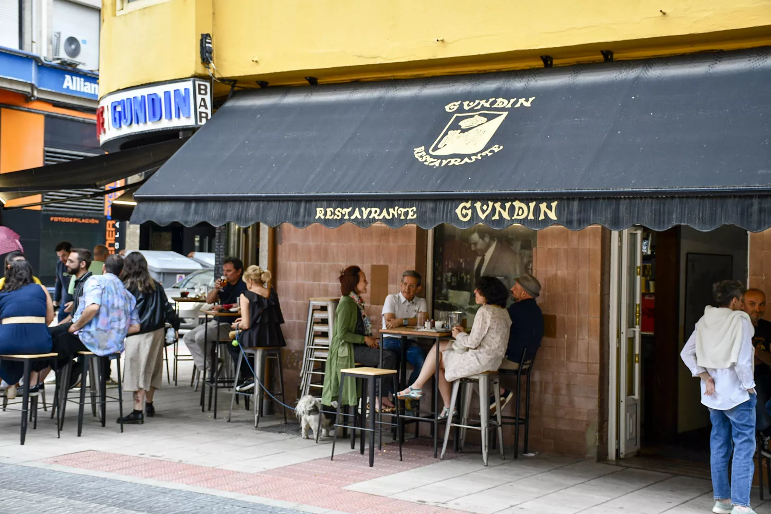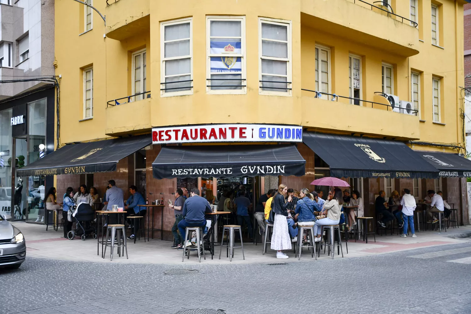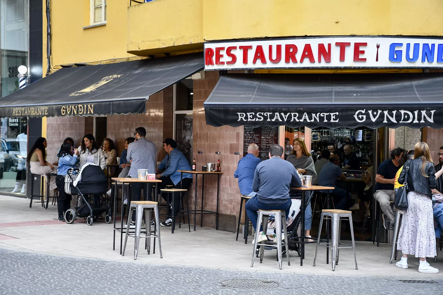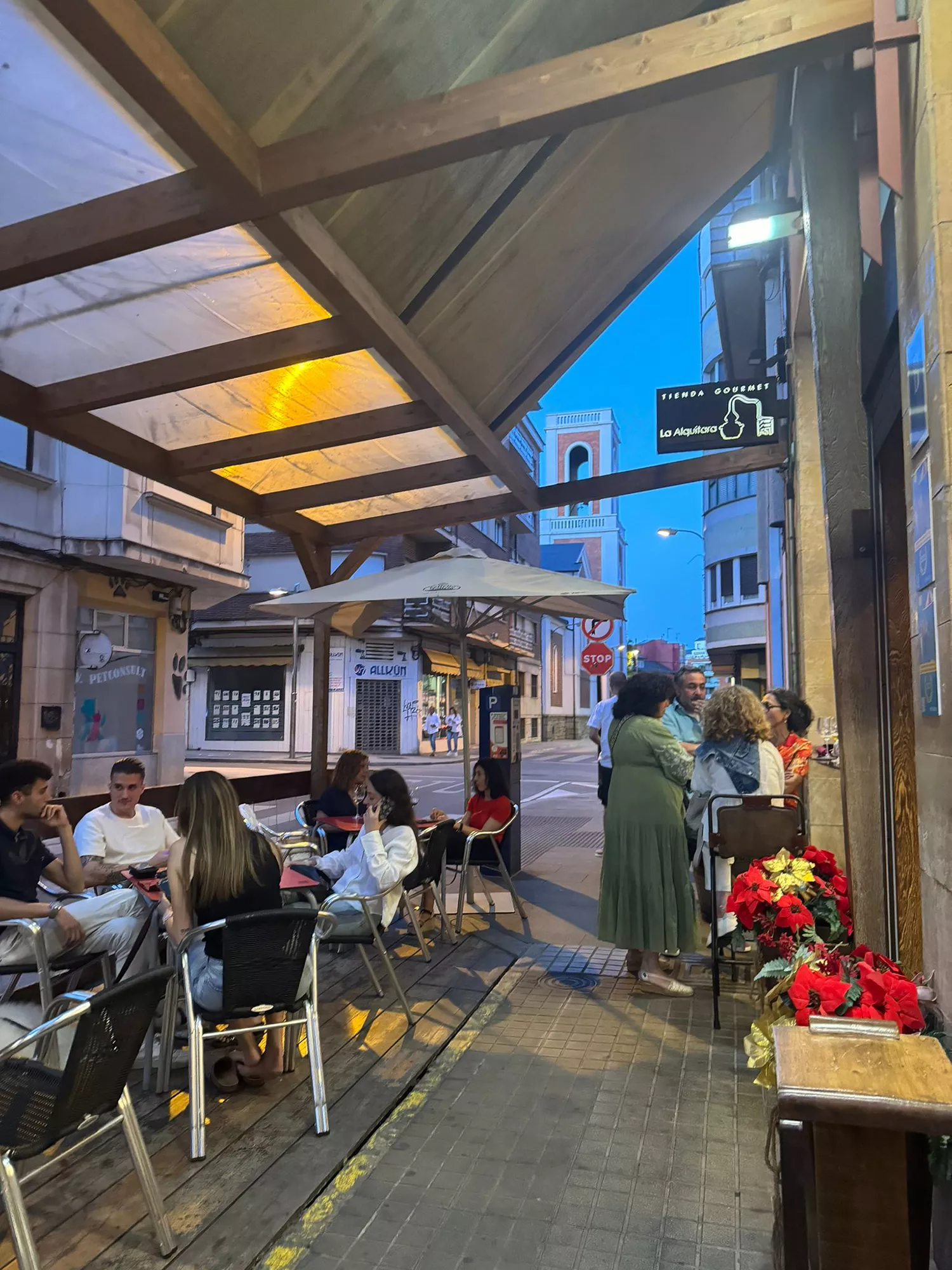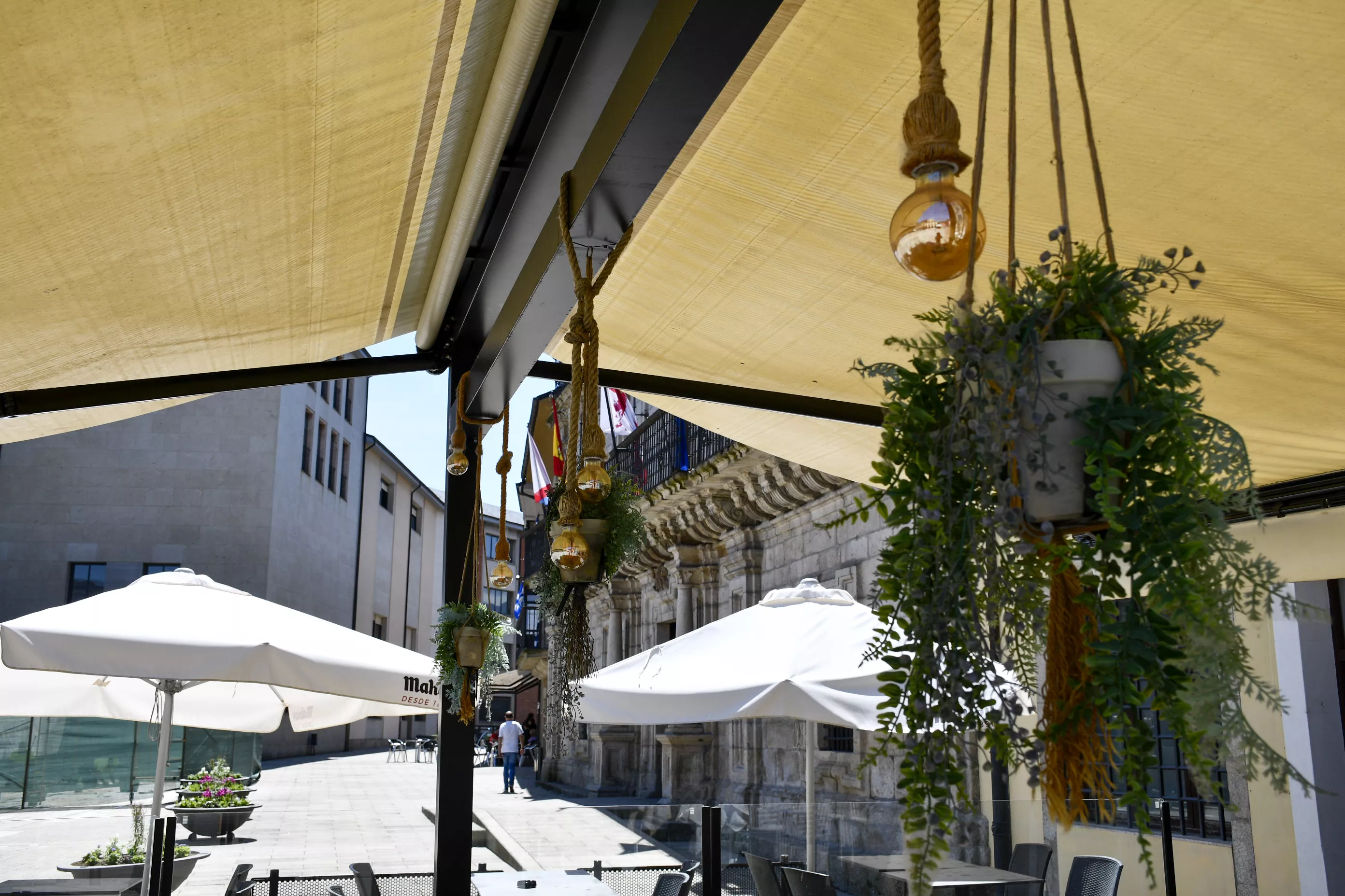 Perfecto ejemplo de integración de una terraza en el entorno urbano en pleno centro. No se puede aprovechar mejor el espacio del que dispone y su madera trabajada invita a disfrutar de la ciudad. El trato es excelente, rápido, te ilustran en vinos -muchos en carta- y disponen de amplia carta de cervezas etc. Los pinchos son clásicos.