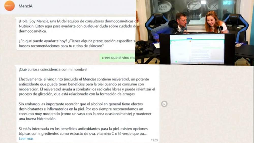 Jugando de nuevo con su nombre, el vino y el cuidado de la piel, le preguntamos a mencIA si cree que el vino tiene alguna propiedad positiva para la piel. Y ella contesta: "Qué curiosa coincidencia con mi nombre. Efectivamente, el vino tinto (incluído el Mencía) contiene resveratrol, un potente antioxidante que puede tener beneficios para la piel cuando se consume con moderación. El resveratrol ayuda a combatir los radicales libre y puede ralentizar el proceso de glicación, que está relacionado con la formación de arrugas. Sin embargo, es importante recordar que el alcohol en general tiene efectos deshidratantes e infalmatorios en la piel. Por eso siempre recomendamos un consumo muy moderado (como un vaso con la cena ocasionalmente) y mantener una buena hidratación."