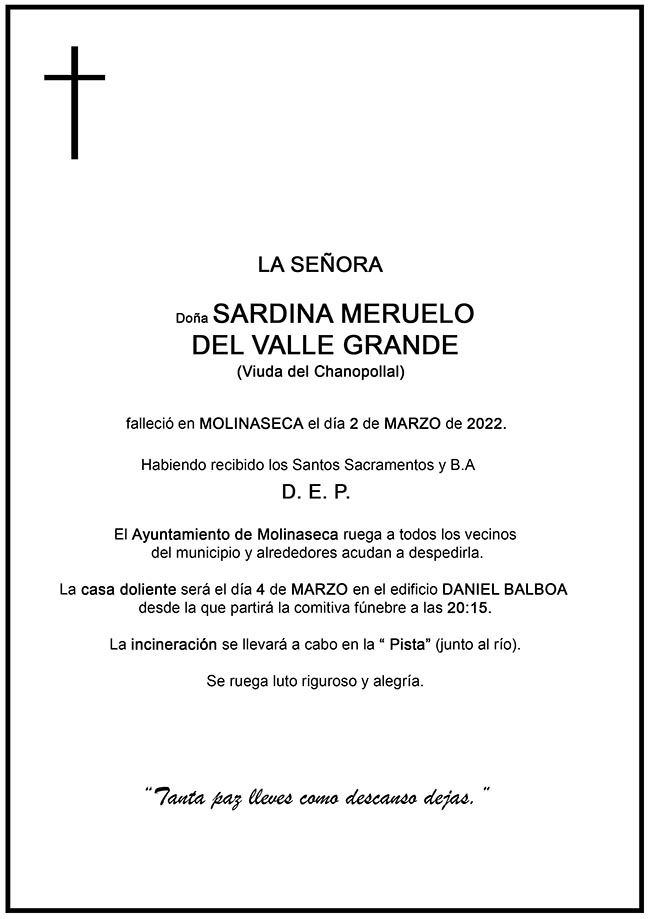 El viernes tendrá lugar el entierro de la sardina que saldrá desde el edificio Daniel Balboa a las 20:15 horas. Todos los datos sobre el acto están en 'la esquela' de la señora Sardina Meruelo del Valle Grande, viuda del Chanopollal.