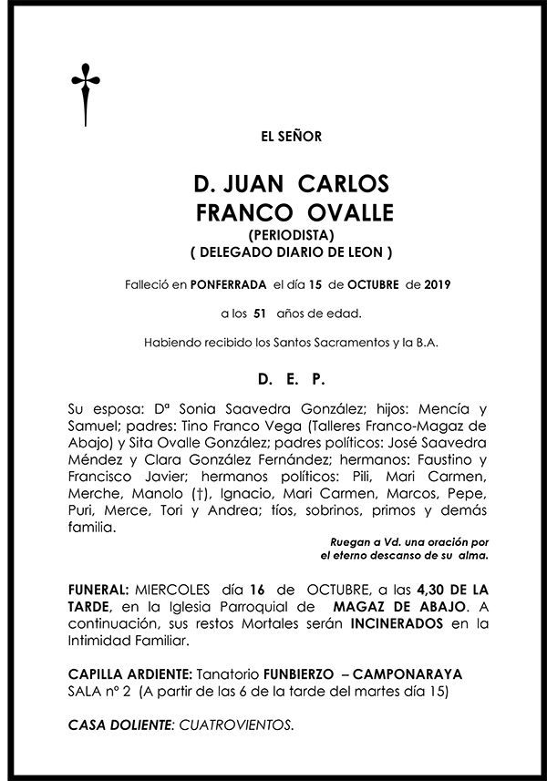 Las primeras reacciones por parte de las instituciones no se han hecho esperar, en primer lugar el Consejo Comarcal de El Bierzo se ha sumado al pesar por el fallecimiento del periodista. "El presidente, corporación y trabajadores de la institución quieren destacar su calidad humana y profesional. Juan Carlos Franco era desde 2013 delegado del Diario de León en la comarca, cuyas oficinas se encuentran en el mismo edificio donde se ubica el Consejo. Su pérdida deja una profunda huella entre quienes forman parte de esta institución".