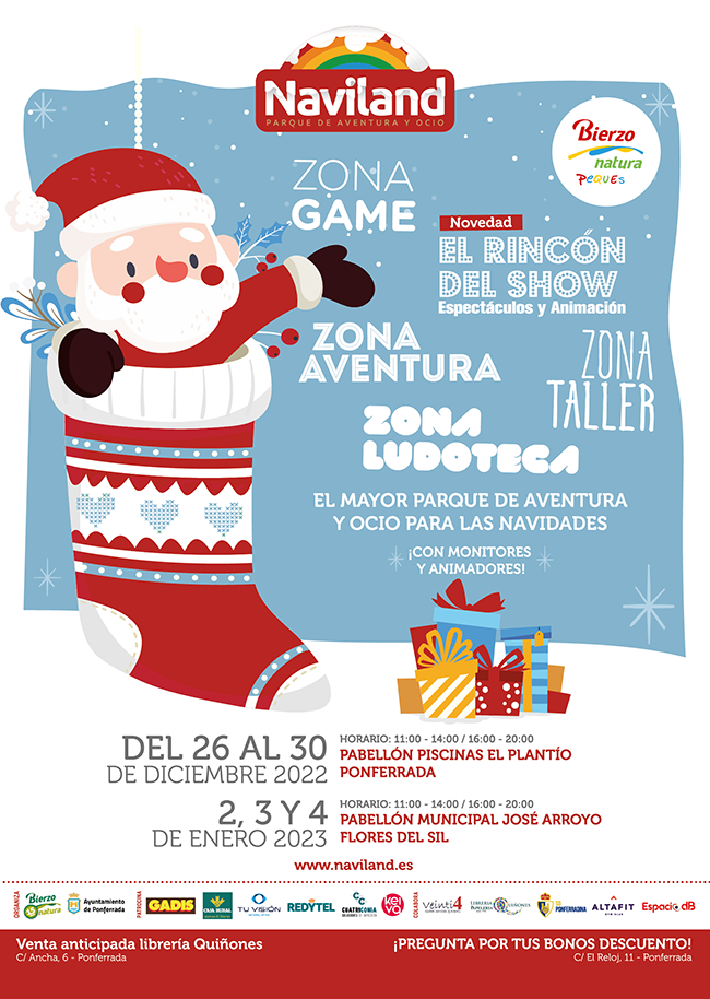 Foto: Cartel Naviland 2022Su ubicación será como el año anterior en el Pabellón Ángel Pestaña del 26 al 30 de diciembre en horario de mañana de 11 a 14 horas y de tarde 16 a 20 horas, y del 2 al 4 de enero Naviland reabrirá sus puertas en el Pabellón Municipal José Arroyo de Flores del Sil con el mismo horario.
