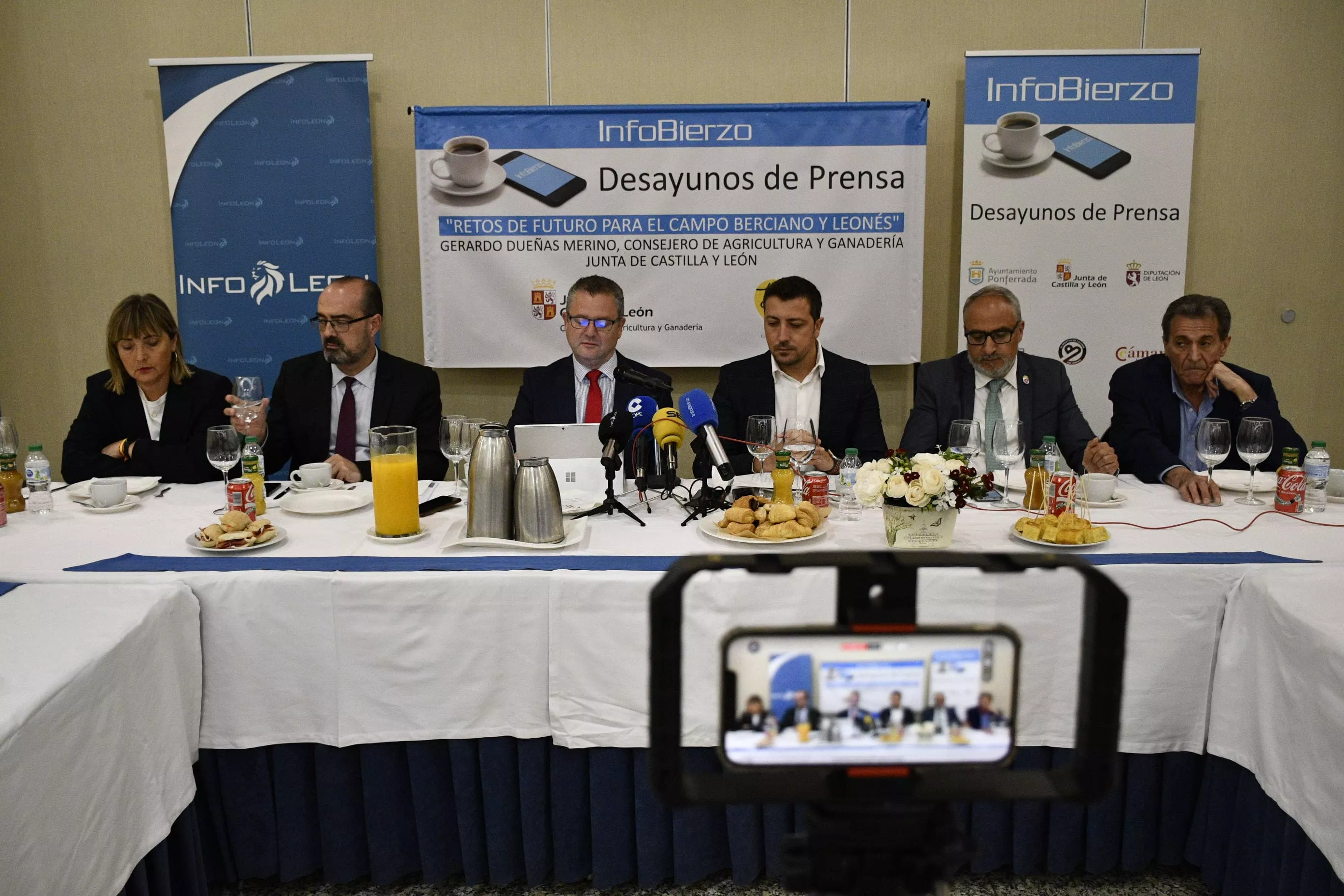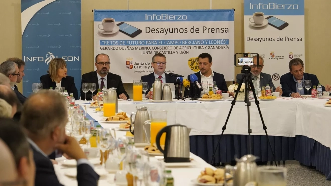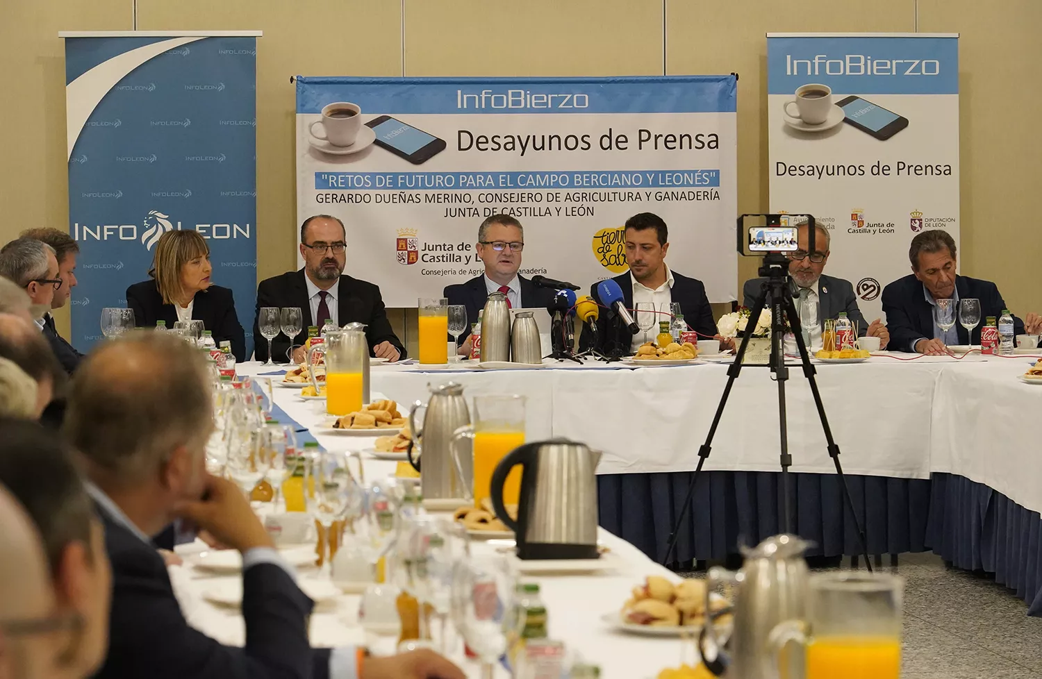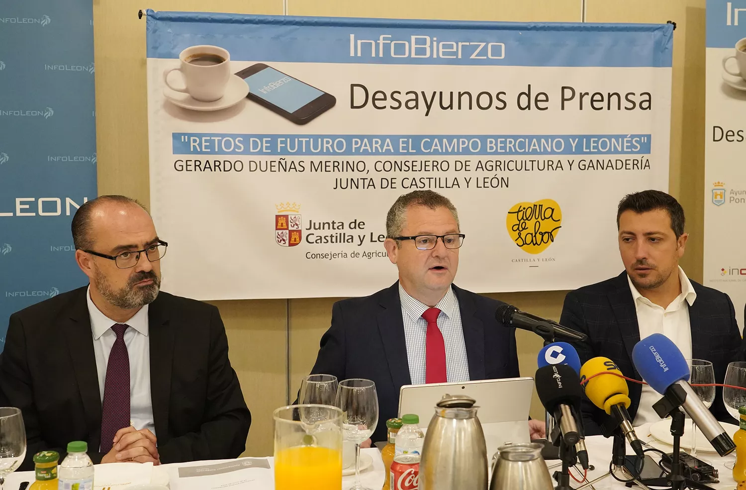 El consejero de Agricultura y Ganadería, Gerardo Dueñas, incidió en el gran trabajo que hacen los productores por conseguir la máxima calidad, especialmente en el León y El Bierzo, donde se encuentran el 30% de las 22 figuras de calidad de Castilla y León. “Las condiciones del Bierzo ofrecen una gran capacidad para la producción. Las ventas de los siete sellos superaron en 2023 los 61 millones de euros en cuota de mercado anualmente. Ahora estamos trabajando en una fase de estudio para la consecución de tres figuras nuevas, dos de ellas en el Bierzo, que son la miel y la IGP de la pera, y otra a nivel provincial que es el chorizo”, añadió en el desayuno de prensa en Ponferrada, organizado por InfoBierzo e InfoLeón, donde repasó la situación de la agricultura y la ganadería en la región leonesa.
