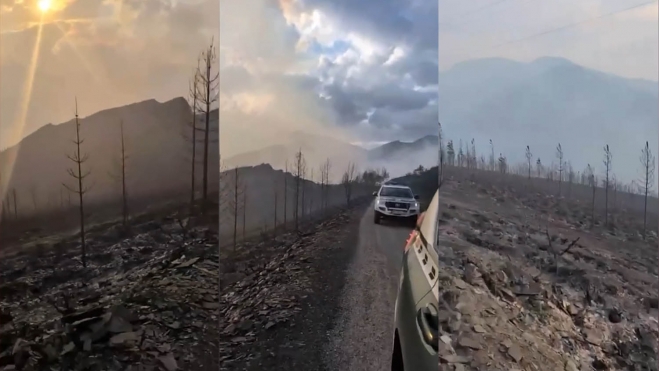 La Guardia Civil recorre las zonas devastadas por el incendio de Gestoso, en las inmediaciones de la localidad de Oencia, para comprobar la extinción real de los focos ya apagados, así como detectar posibles reactivaciones o la aparición de nuevos puntos de fuego.