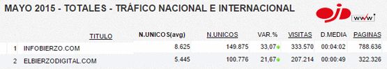 El liderazgo en el soporte digital ha sido solvente y se amplía aún más respecto a los 5 años ininterrumpidos de referencia en la red de la Comarca. InfoBierzo es el medio que más crece además en mayo, un 33% (21% el siguiente competidor). ElBierzoDigital registró 100.776 lectores úncios (49.000 IPs menos, o lo que es lo mismo, la distancia entre ambos medios es la mitad de su audiencia total), 207.214 visitas (por 333.570 InfoBierzo) y 322.326 visitas (menos de la mitad que InfoBierzo, con 788.636).