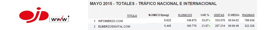 La ficina para al Justificación de la Difusión (OJD) de España ha publicado este jueves las actas correspondientes a mayo, y certifican 149.875 lectores únicos (IPs) para InfoBierzo, con 333.570 visitas totales y 788.636 páginas vistas. El tiempo en el sitio del lector fue de 4 minutos y dos segundos de media.