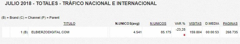Y en El Bierzo, con las actas DE JULIO publicadas hoy mismo, InfoBierzo triplicaría en la mayoría de registros a elbierzodigital, que queda reducido a un tráfico real llamativamente pobre de 85.000 IPs mensuales, 159.804 visitas, 53 segundos de media de tiempo en el sitio, 1.6 páginas por visita, 268.735 páginas vistas totales, y 4.541 IPs únicas de media diaria. Datos que remontan a elbierzodigital a registros que lograba en octubre de 2015. Desde entonces, el crecimiento que publicitaban, no ha sido tal. Las cifras vuelven a su cauce.