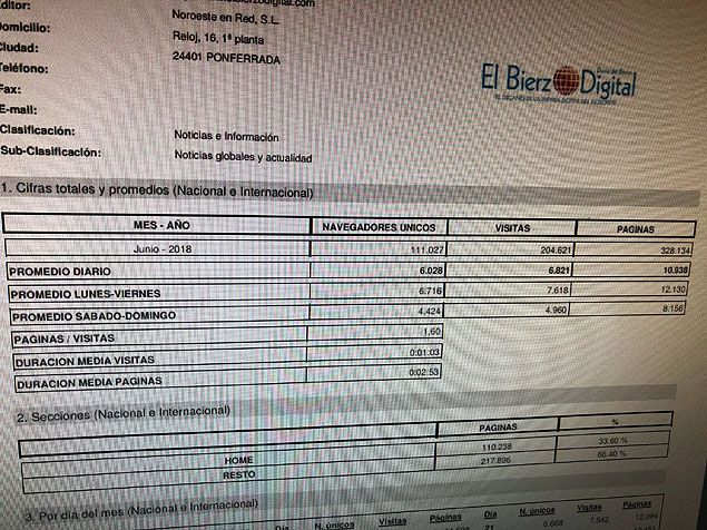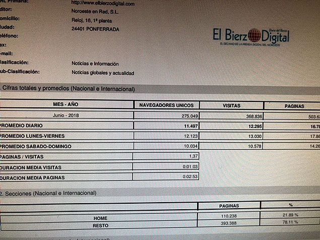 Los digitales del grupo Noroeste en Red (NER) han sufrido una corrección por parte de este organismo de control de audiencias. Tanto AstorgaDigital como ElBierzoDigital presumían en sus publicaciones, del crecimiento espectacular de su audiencia en los informes semestrales, con 'elaboradas' gráficas. De hecho arrancaron bajo control de OJD en diciembre de 2014 -ya con más de 10 años de recorrido dicha web- sumando al mes 46.494 IPs, con 2.807 IPs de media diaria, 107.451 visitas mensuales y 259.715 páginas mensuales ... y en 3 años , hecho sin precedentes en la historia de una web informativa local en España, registraron un crecimiento medio sostenido de un 30% cada mes, hasta lograr un total de incremento de tráfico en poco más de 3 años de un 610% marcando, en junio de 2018, unos registros de 275.000 IPs, 368.000 visitas (casi el 75% de sus visitas totales vendrían de IPs distintas), 503.000 páginas y 11.000 IPs de media diaria. Pero ahora, más de la mitad del tráfico ha sido corregido en las actas de abril, mayo y junio por posible fuente irregular, al menos para su certificación por OJD.