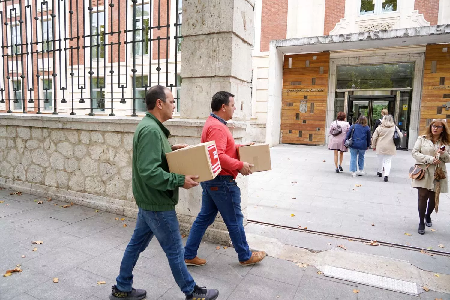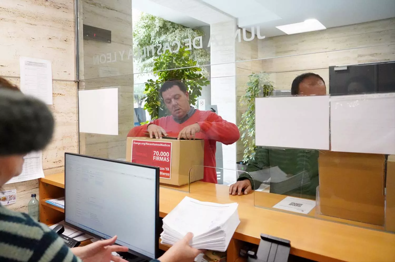 Miembros del colectivo Oncobierzo, quienes pusieron en marcha hace un mes varias iniciativas para reclamar la llegada de oncólogos y otros facultativos al Hospital del Bierzo, entregaron este martes en la Consejería de Sanidad de la Junta de Castilla y León, en Valladolid, 70.000 firmas para conseguir este fin.